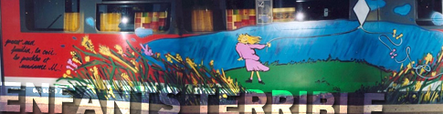 erik: Es müsste bei mir nicht zwingend Graffiti das Medium sein, über das ich mich äussern muss, aber es ist es auf jeden Fall momentan, weil man sich da einfach austoben kann. Es gibt keine Grenze, höchstens die Wand hört irgendwann auf, deshalb funktioniert Graffiti in Galerien auch nicht, weil spätestens nach 1,20m Schluss ist. Graffiti gehört auf die Strasse, in die große Umgebung. Weiterhin hab ich ein Äusserungsdefizit, ich muss was sagen zur beschissenen Lage zurzeit, zu meinem Namen, zu meiner Crew und das macht momentan Graffiti für mich aus. Eben ohne Grenzen, sobald es mit Aufträgen anfängt gehts dann schon: 'Könnt ihr mal Skizzen abgeben.' oder 'Das und Das gefällt uns nicht.' Eigentlich müsste es so gehen, 'Gebt uns die Kannen und wir malen was.' Das ist Graffiti. Alles andere wäre Kommerz und Mainstream.